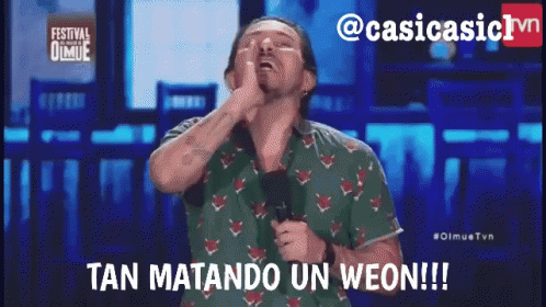 Comedian Felipe Avello shouts 'Tan Matando un Weon!!!' during his performance at the Festival de Olmué.