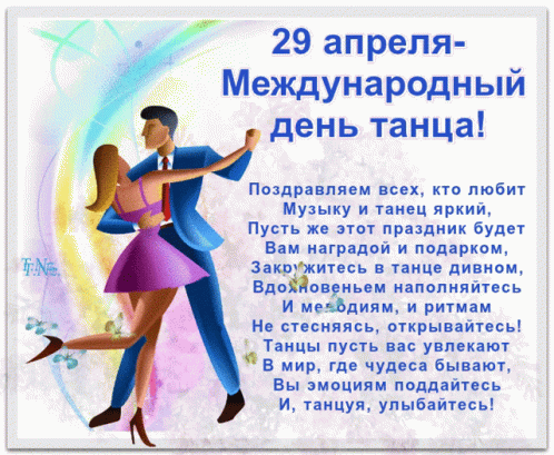 Celebrating International Dance Day on April 29th with a dancing couple and a festive message.