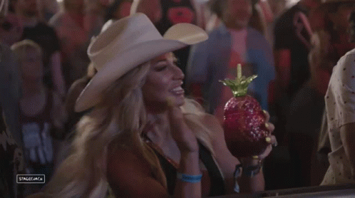 Yola, wearing a cowboy hat, sips from a pineapple-shaped drink and enjoys the music at the Stagecoach festival.