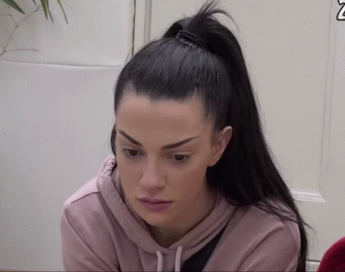 Tara Simov from Zadruga4, wearing a pink hoodie and a high ponytail, looking contemplative.