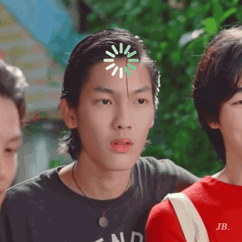 Taratiwat ต้าบอม with a loading bar on his forehead, looking confused and deep in thought.