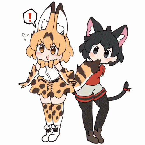 Serval and Kaban from Kemono Friends, with Serval showing surprise, in a cute anime art style.