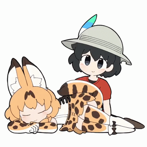 Taro gently pets the sleeping Serval, a heartwarming moment between the Kemono Friends characters.