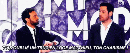 Camille Combal addresses Matthieu Delormeau with a playful remark about his charisma during a TV show.