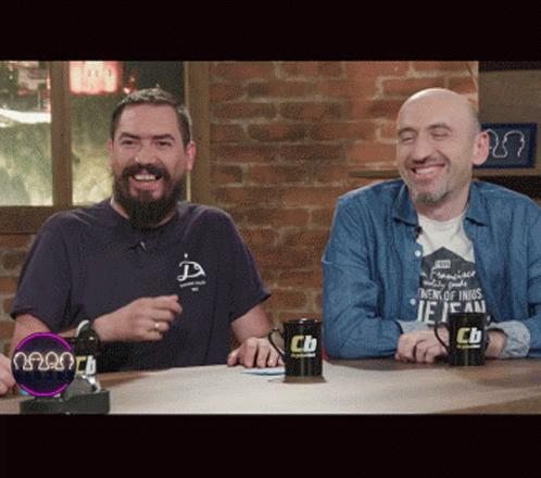 Two men, including Vakh and Iko, are laughing and one claps at a table with 'Cb' mugs.