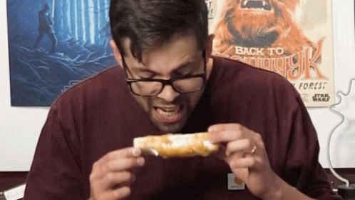 Nick Zetta takes a massive bite out of a sweet roll, intensely focused on his taste test.