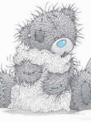 A cute Tatty Teddy bear holds a soft pillow and a small piece of paper, sparkling gently.