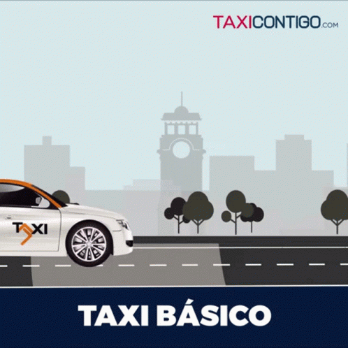 Animated advertisement showcasing the TaxiContigo app's Basic, Plus, and Premium taxi services with a car transforming.