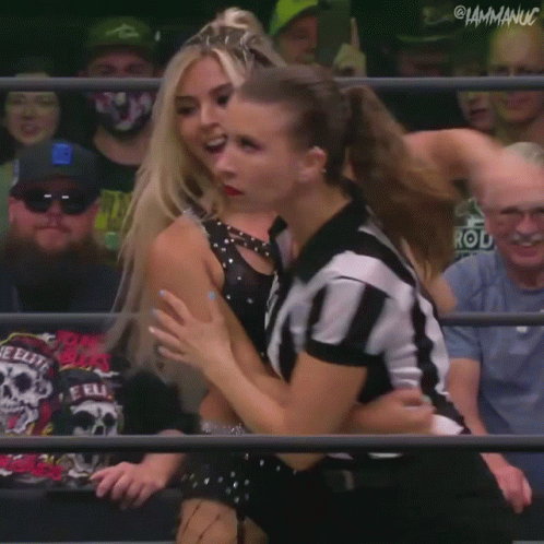 Wrestler Tay Conti (Taynara Conti) shares a sweet moment, kissing referee Aubrey Edwards on the cheek during an AEW event.