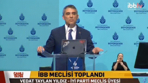 Taylan Taylan Yıldız, an IYI Party Assembly Member, speaks at a podium and displays 'S' and 'J' cards.