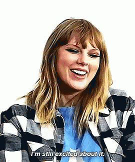 Taylor Swift, wearing a plaid jacket, smiles and expresses her excitement, saying 'I'm still excited about it.'