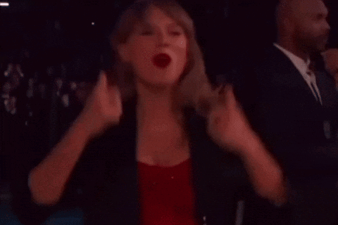 Taylor Swift cheering excitedly in a red dress at the Grammys, celebrating with enthusiasm.