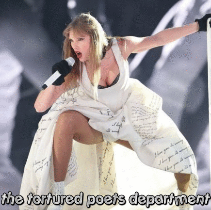 Taylor Swift performs in a white dress, with 'the tortured poets department' text displayed, likely from the Eras Tour.