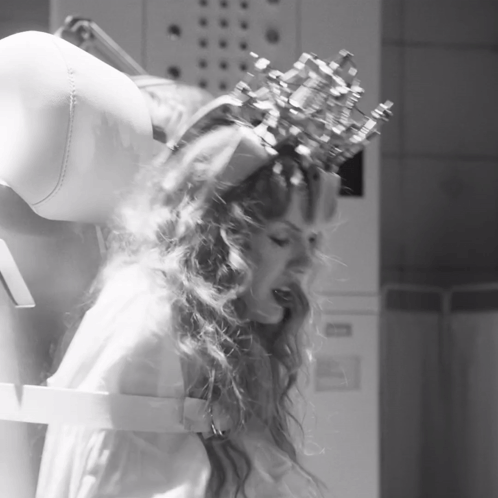 a woman with a crown on her head screams in a black and white photo