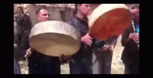 Men playing traditional Amazigh Chaoui music with tbatent drums and gasba.