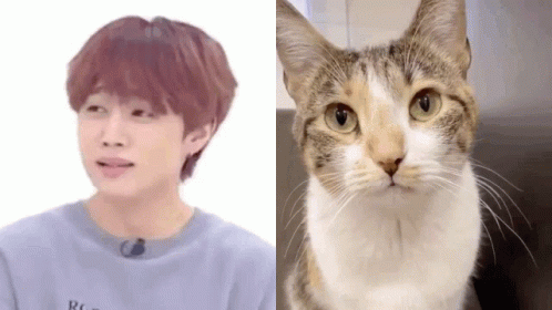 The Boyz's Sunwoo looks on as a cute tabby cat appears sad, looking down in this split-screen video.