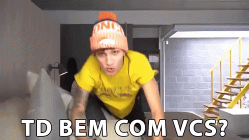 Christian Figueiredo, wearing a beanie and yellow shirt, greets the audience with 'Td Bem Com Vcs?'.