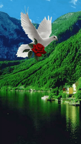 A beautiful white dove carrying a red rose flies gracefully over stunning landscapes, symbolizing love and peace.