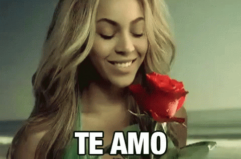 Beyoncé smiles gently while holding a vibrant red rose, with the Spanish phrase 'Te Amo' displayed.