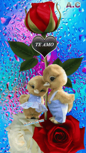 Adorable plush ducklings, one in a dress and one in overalls, with roses and a 'Te Amo' heart, surrounded by sparkling stars.