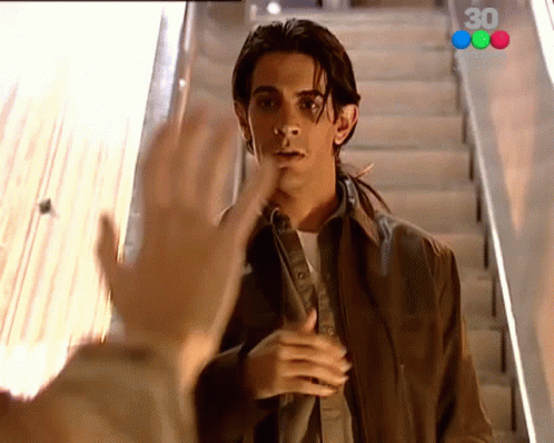Pablo Echarri, as Santiago Diaz Herrera, stands on an escalator looking surprised with his hand on his chest.
