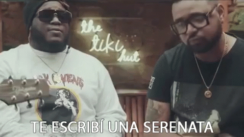 Two men perform the romantic song "Te Escribí Una Serenata" with a guitar in a tiki hut setting.