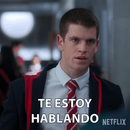 Guzmán (Miguel Bernardeau) from Elite says 'Te estoy hablando' ('I am talking to you') with intensity.