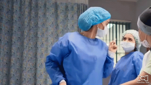 Maria Clara Gonzalez (Diana Hoyos) in surgical attire, pointing and warning another woman in a hospital setting.