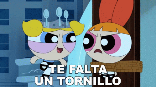 Bubbles (Burbuja) from Powerpuff Girls, wearing a spoon crown, tells Blossom (Bombon) 'You're missing a screw'.