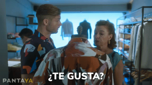 Valentin is asked '¿Te gusta?' by a woman in a clothing store, from 'El Juego De Las Llaves' featuring Horacio Pancheri.