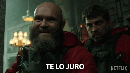 Helsinki from Money Heist emphatically says 'Te Lo Juro' (I Swear It) while holding a gun.