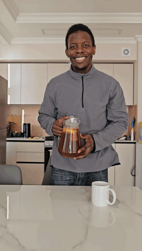Kevin Dufresne smiles while holding a pitcher of refreshing iced tea with lemon, spreading good vibes.