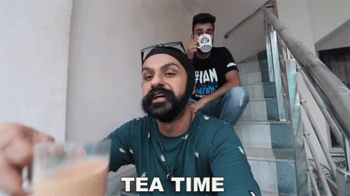 Jasminder Singh enjoys a refreshing tea break with a friend on the stairs. Perfect time for chai.