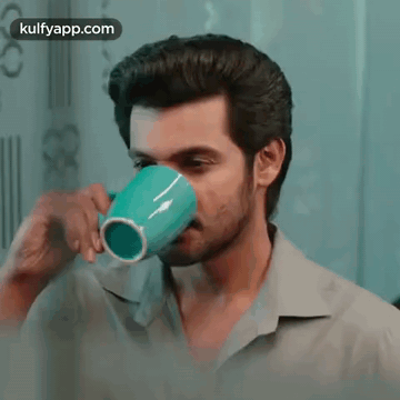 Telugu actor Aadi Saikumar enjoys a relaxing coffee break, sipping from a green mug in a calm setting.