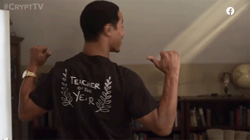 Lewis Thomas proudly displays his 'Teacher Of The Year' shirt, pointing to himself in celebration.