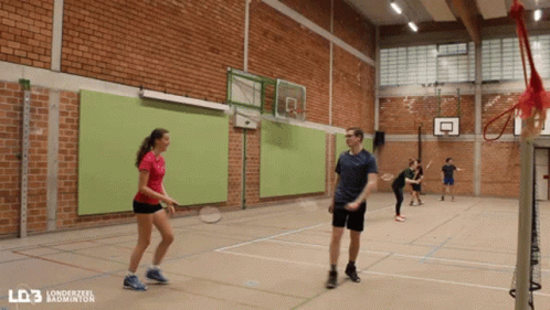 A man and a woman demonstrate teamwork while playing badminton in a gym, featuring Londerzeel Badminton.