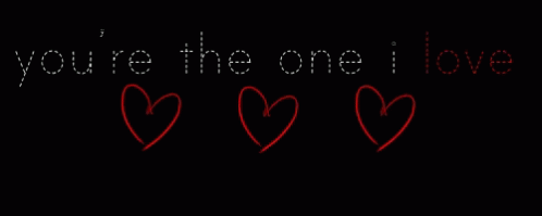 Animated text revealing 'you're the one i love' followed by three red hearts on a black background.