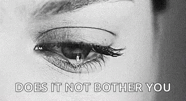 A close-up, black and white shot of an eye with a tear, accompanied by the text 'Does It Not Bother You'.