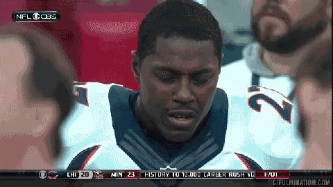 Knowshon Moreno, the 'Tear Monster' Bronco, on the sidelines during an NFL game with scoreboard details.