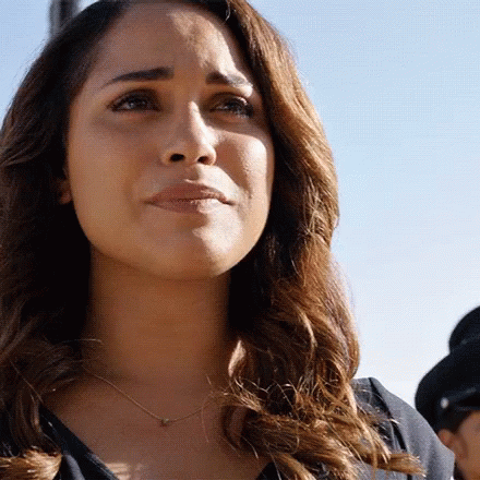 Monica Raymund as Gabriela Dawson from Chicago Fire, smiling with tears of joy and a radiant expression.