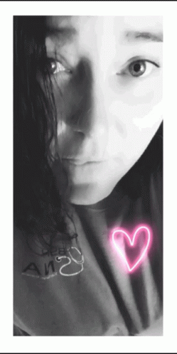 Woman in black and white winks and bites her lip seductively, wearing a shirt with a design.