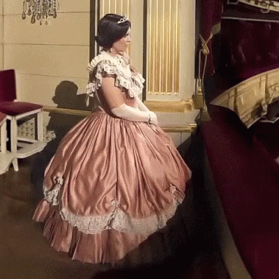 Princess Isabel in a historical pink gown and gloves stands in a theater box at Teatro Real.