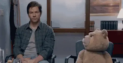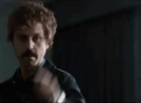 Ted Freshcakes, a man with a mustache, points forward with an intense expression in a dimly lit scene.