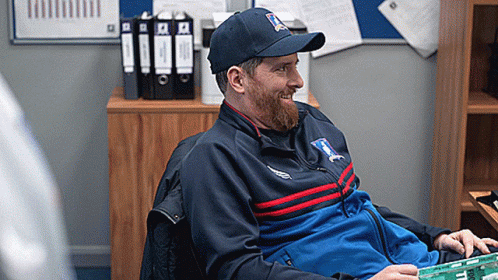 Coach Beard from Ted Lasso gives a thumbs down while sitting at a desk, wearing a cap and tracksuit.