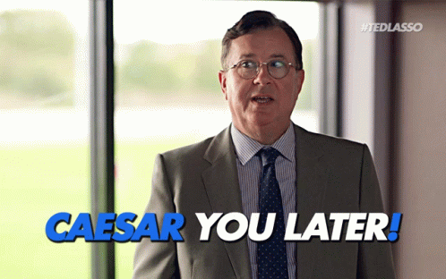Higgins from Ted Lasso, wearing a suit and glasses, says 'Caesar You Later!' with a smile.