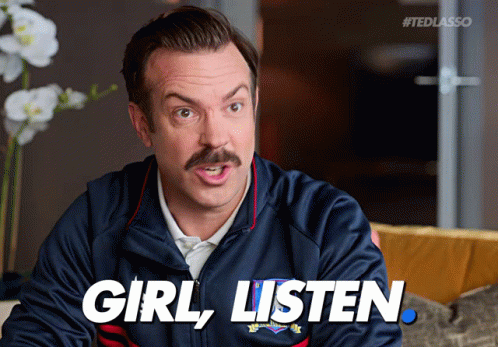 Ted Lasso (Jason Sudeikis) delivers a direct message, saying 'Girl, listen,' while sitting on a couch.
