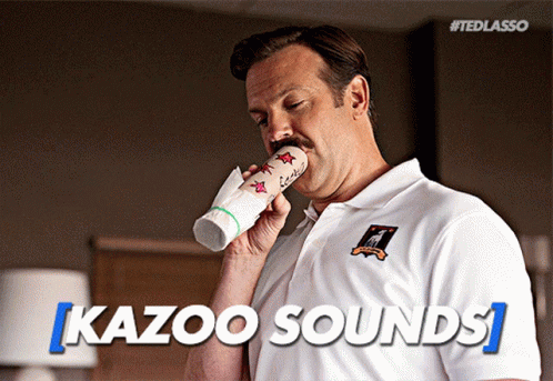 Ted Lasso (Jason Sudeikis) plays a kazoo made from a paper cup, creating funny sounds.
