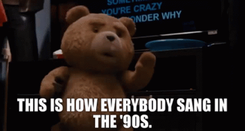 Ted the teddy bear demonstrates how everyone sang in the 90s, with karaoke lyrics on screen.