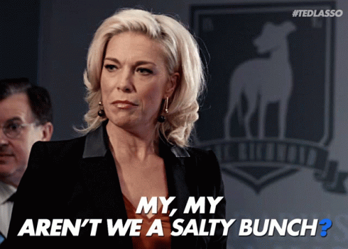 Hannah Waddingham as Rebecca Welton delivers the iconic line, 'My, my, aren't we a salty bunch?' from Ted Lasso.