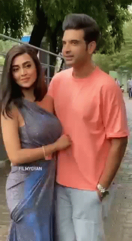 Tejasswi Prakash and Karan Kundrra pose together on a sidewalk, looking at the camera.